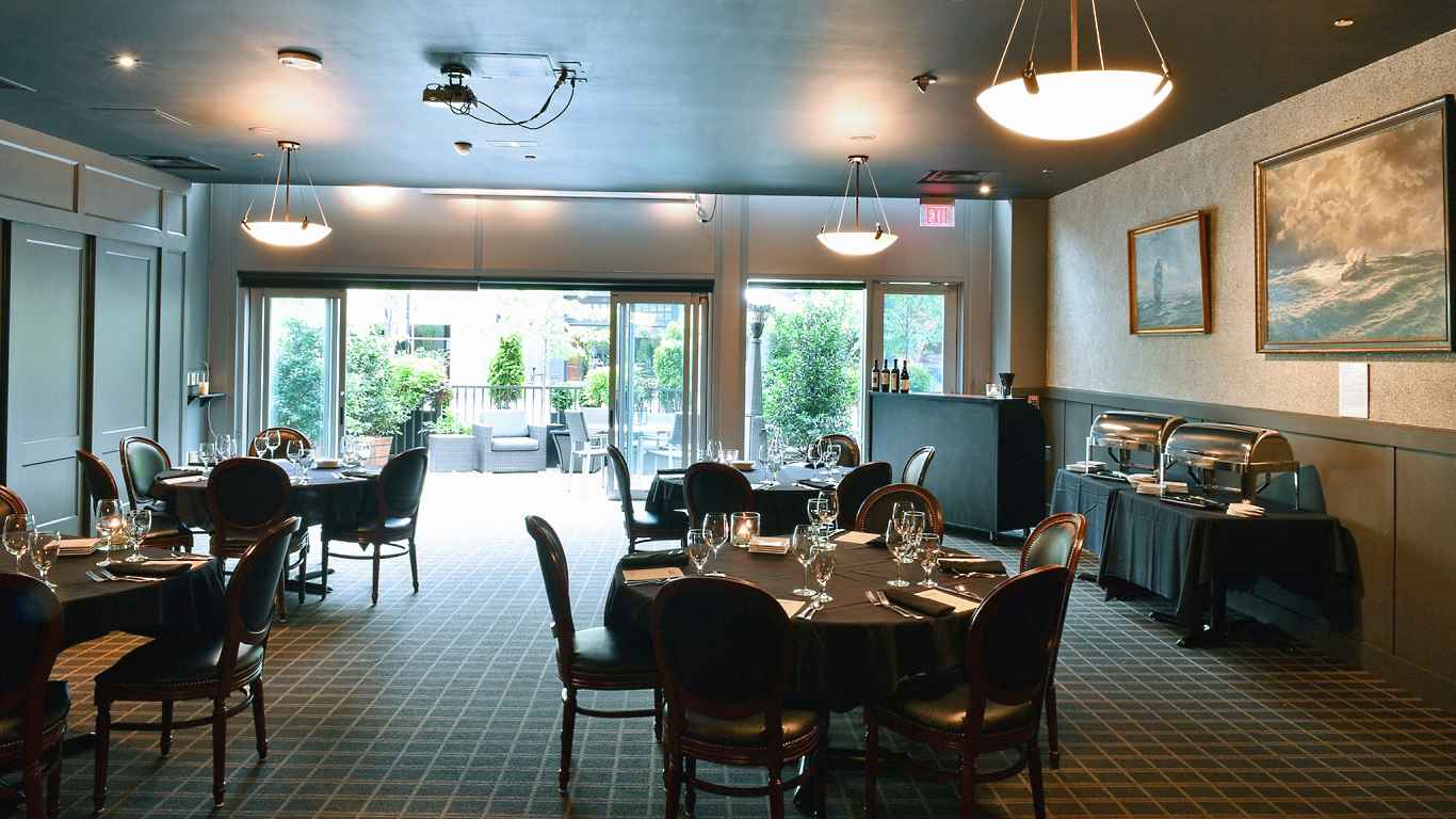 Specs: The Fortune Room can accommodate up to 45 at round tables for a seated meal. It can be set for up to 35 at crescent rounds for a presentation. U-shaped tables, squares, and long tables can also be considered. Cocktail receptions can accommodate up to 60. A bar may be equipped if needed. There is a descending screen and projector available for presentations. The patio includes tables, chairs, a fire pit table and heater.