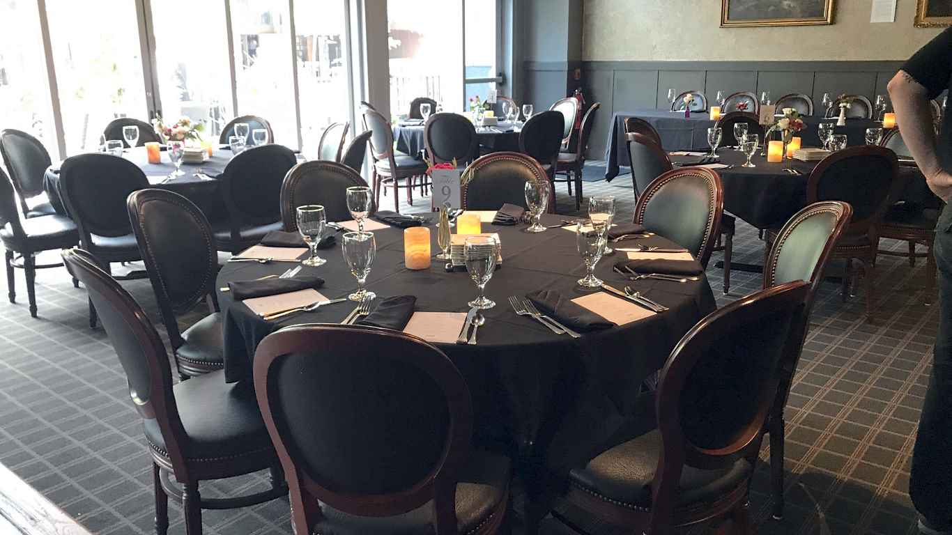 Specs: The 580 Room can accommodate up to 80 at round tables for a seated meal. It can be set for up to 55 at crescent rounds for a presentation. U-shaped tables, squares, and long tables can also be considered. Cocktail receptions can accommodate up to 120. Multiple bars may be equipped if needed. There is a descending screen and projector available for presentations. The included patio walk-out space will have tables, chairs, a fire pit table, and heater.